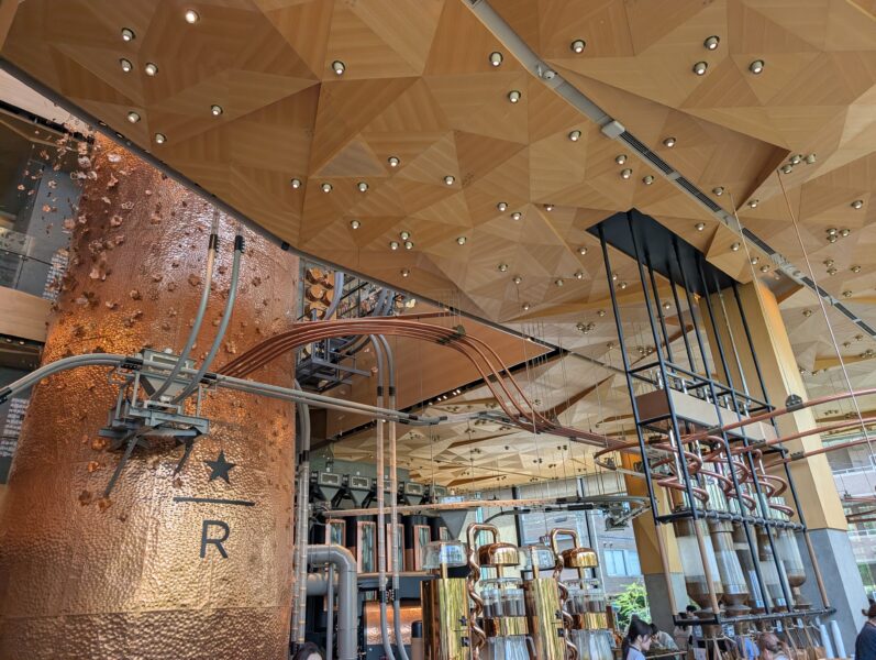 本日は、目黒区青葉台にあるスターバックス リザーブ® ロースタリー 東京の紹介です。スターバックス リザーブ® ロースタリー 東京は世界に数店舗しかないスターバックスのこだわり抜いた店舗になっています。外観の設計は日本を代表する建築家の隈研吾氏がデザインされています。立地も目黒川添いにあり、晴れた日にはテラスでは東京産の杉の木を加工したテーブルやいすでゆっくり過ごさせて頂くと気持ちが良いです。又、桜の季節には多くの人が来店されるのが想像できます。4階建の建物になり各階に特徴がありコーヒー・ティーはもちろん、色々な食べ物やコーヒーやティーを使用したカクテル・モクテルを楽しめるバーもあり、まるで「コーヒーの遊園地」のようです。まだ、行かれていない方には是非一度は来店して頂きたい場所です。